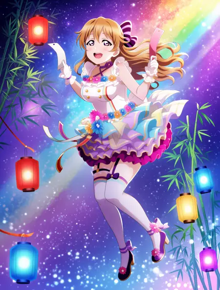 (loveumyfriends dress, flower-trimmed dress, multicolored dress, layered skirt:1.2), criss-cross halter, flower-trimmed choker, flower on chest, vertical stripes, thighhighs, pearl ornament on skirt, white waist bow, (waist strap:0.8), flower-trimmed gloves, wrist cuffs, bridal garter, flower-trimmed strappy heels, (ankle ribbon:0.8) BREAK