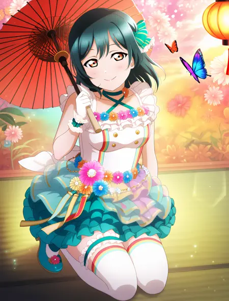 uehara ayumu, medium hair, pink halterneck strap, pink inner skirt, two buttons, asymmetrical mismatched legwear, pink high heels, pink bow, flower-trimmed hair bow- 🏷️ 三船栞子 / mifune shioriko