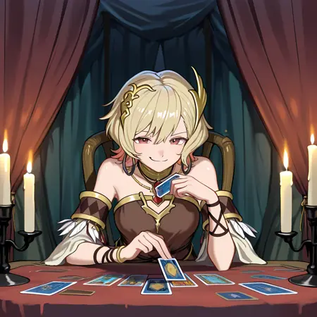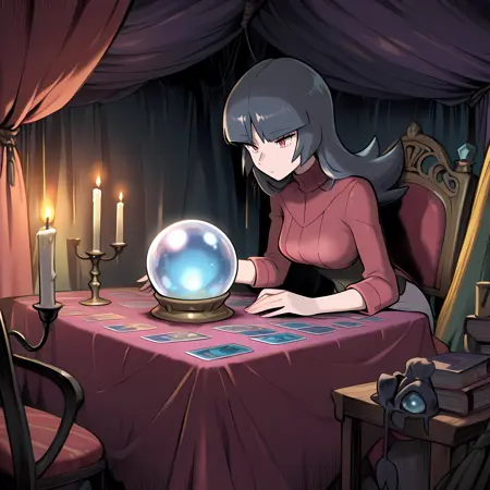 Additional: table, crystal ball, candle, curtains, tent interior, candlestand, chair