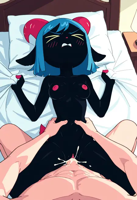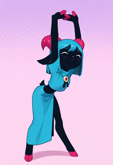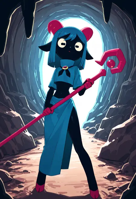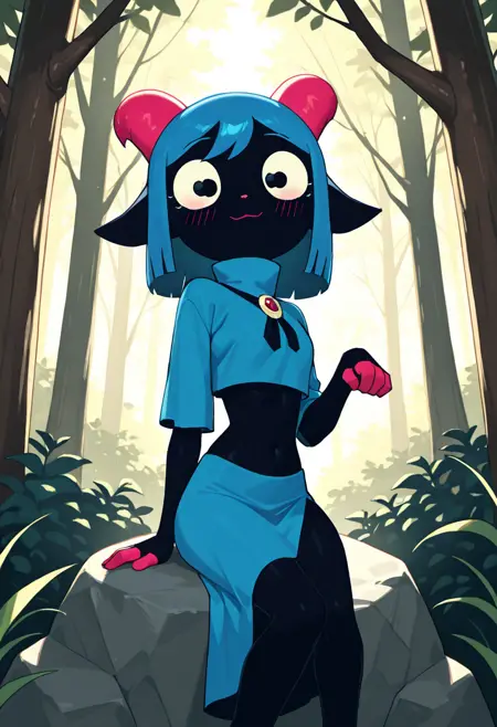 1girl, solo, amara, blue hair, colored skin, skirt, blue cloth, black eyes, yellow sclera, yellow nose