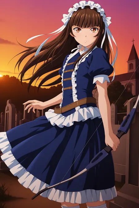 teni, long hair, brown hair, headdress, chin strap, sidelocks, blunt bangs, brown eyes, puffy short sleeves, blue dress, frilled dress, medium dress, loose belt, blue socks, kneehighs, lace-trimmed legwear, blue footwear, mary janes