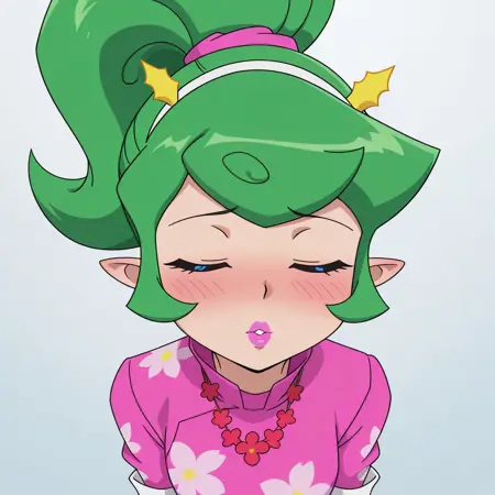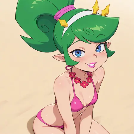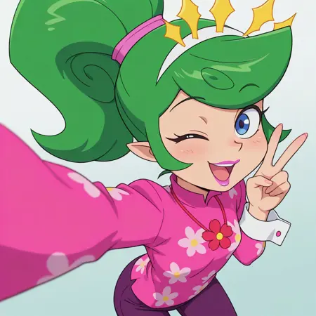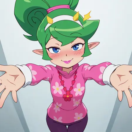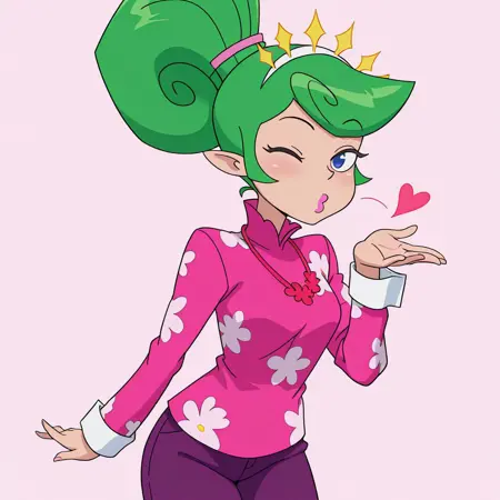 어두운 녹색 머리카락, 높은 언더테일, 파란 눈, 밝은 파란 아이섀도우, 핫 핑크 립스틱, 뾰족한 귀, 노란색 스파이크가 있는 흰색 헤드밴드, 흐린 핑크 헤드밴드, 핫 핑크 플로럴 셔츠, 빨간 꽃 모양의 목걸이, 높은 칼라, 큰 흰색 소매단, 어두운 보라색 바지, 날카로운 흰 신발