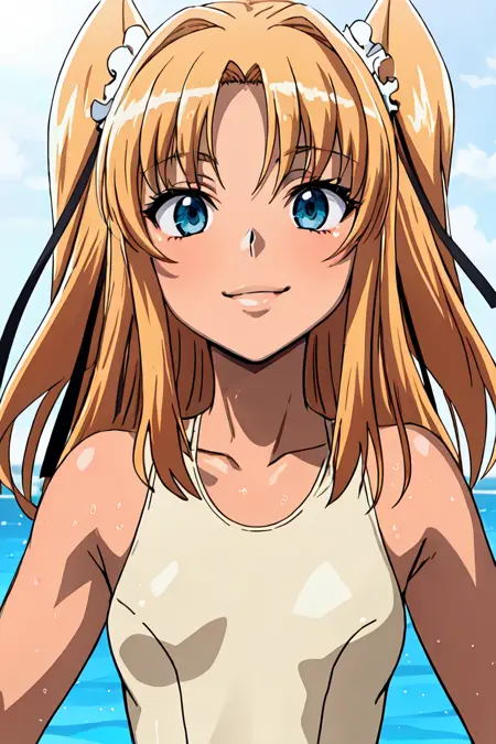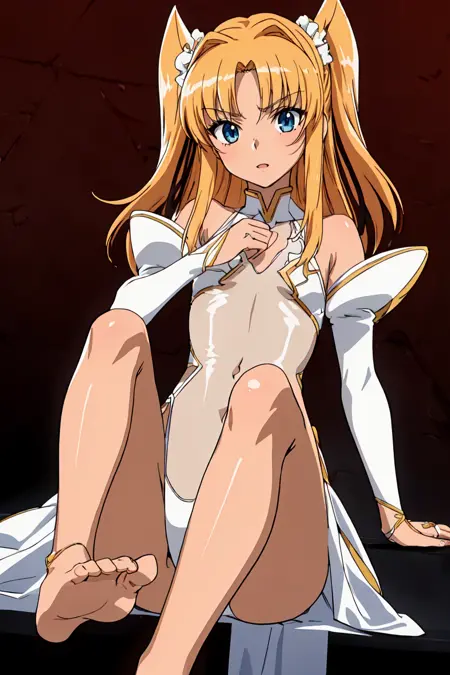 Leotard: white leotard, white elbow gloves, bridal gauntlets, see-through, highleg leotard, covered navel. For back view use thong leotard and backless outfit (most times work with only white leotard. I simply couldn't decide, how to write this outfit. Some parts can be persistent with random outfits, so add them to negative when needed)