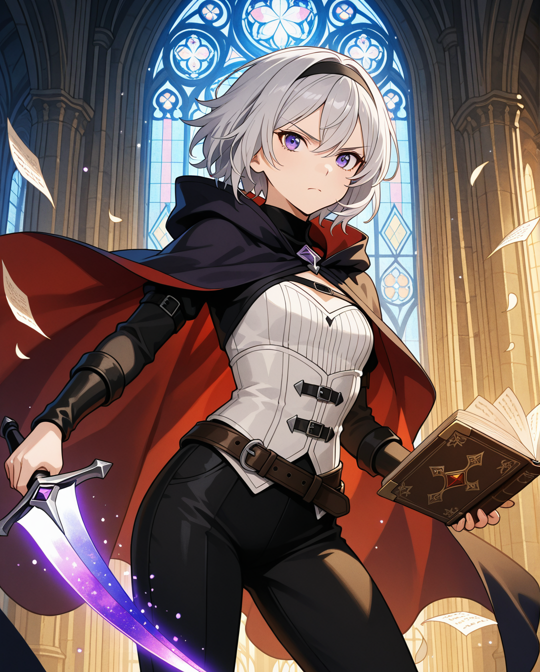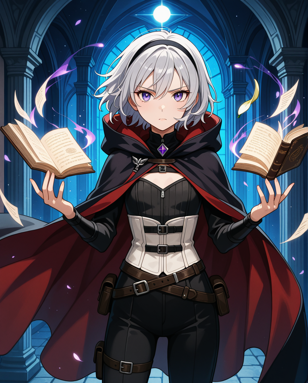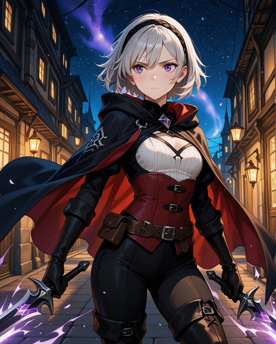 カラは、本が神話的な力を目覚めさせるダークファンタジー世界『ラスト・リーダー・スタンディング』に登場するオリジナルキャラクターです。キリンのスラムで育ち、泥棒としての生活を経て、『ナイトクイーンの書』と結びついた影の刺客となります。彼女は優雅さと危険性の完璧な融合を体現しています:短い銀髪、鋭いパープルの瞳、筋肉質でしなやかな身体に、白いコルセット、赤いラインが入ったマント、そして二本の呪われた短剣を携えたゴシックブラックの刺客の衣装を纏っています。このLoRAは、彼女の静かなる性質、ネコのような姿勢、そして悲劇的な美しさを強調しながら、視覚的アイデンティティを忠実に捉えています。月光の下で静かに佇むも、影から襲うも、カラは常に冷たく鋭い集中力と神秘的な優雅さを放ちます。
