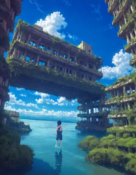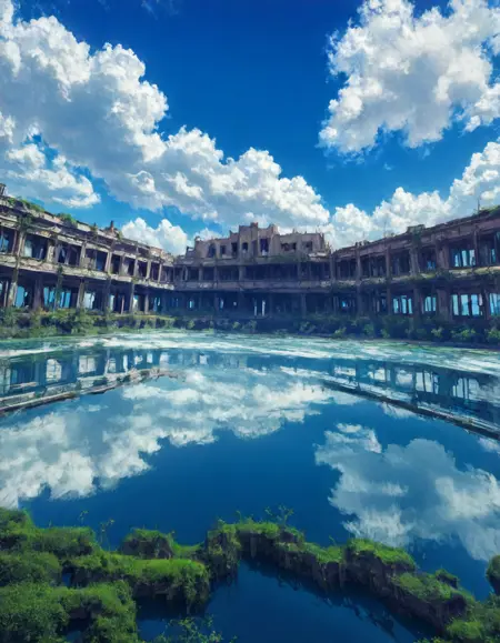 illJPStaryBkGround, The image depicts a surreal, abandoned architectural structure with multiple levels, partially submerged in water. The building's facade is overgrown with vegetation, giving it a dilapidated and decaying appearance. The water reflects the sky, creating a mirror-like effect that enhances the sense of depth and tranquility. A person is standing near the bottom center of the image, gazing at the reflection in the water. The sky is a vivid blue with fluffy white clouds, contrasting with the darker tones of the decaying building. The overall scene evokes a sense of mystery and wonder, blending natural and man-made elements seamlessly.