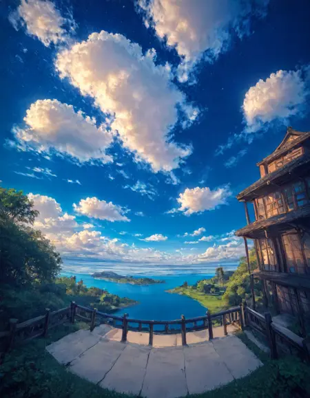 5. Positive call words:illJPStaryBkGround,The image depicts a picturesque scene of a traditional Japanese house with a thatched roof partially covered in lush green vegetation. The house is elevated on wooden stilts,and its large windows reflect the bright blue sky with fluffy white clouds. In front of the house,there is a well-maintained garden with vibrant green grass and a stone pathway leading to the house. A person wearing a straw hat and a light-colored top is sitting on the porch,enjoying the view. The overall atmosphere is serene and inviting,with a clear view of the horizon and a body of water in the background.,