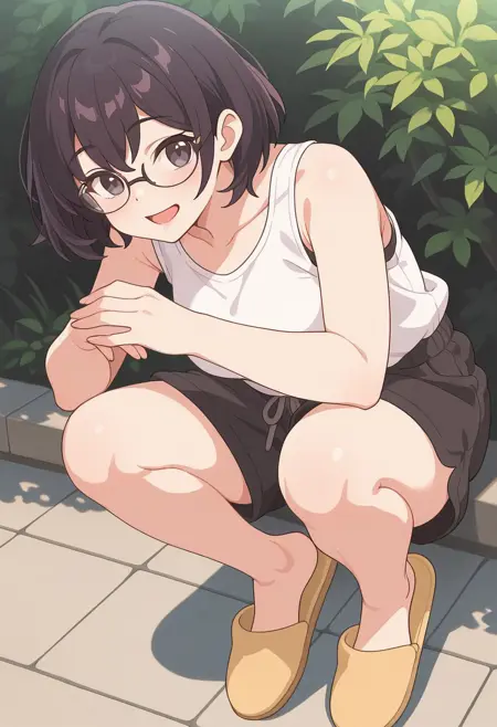 solo, 1girl, glasses, smile, open mouth, bangs, short hair, white tank top, black, shorts, slippers, dionela_pose, full body, from above, looking at the viewer, from above, outdoor, best quality, masterpiece, 4k resolution