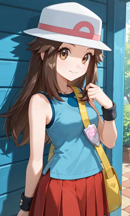 잎, 1소녀, 솔로, 갈색 머리, 긴 머리, 속눈썹, 갈색 눈, 흰색 머리장식, 폭크피 모자, 파란색 셔츠, 소매 없는 셔츠, 빨간 치마, 주름 치마, 팔찌, 메신저 백, 어깨 백, 노란 백,
