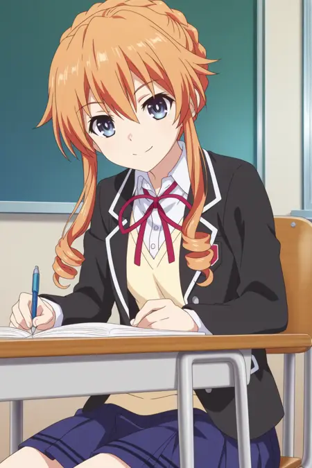 aakaguya, 파란 눈, 주황색 머리, 왕관 땋은 머리, 드릴 머리, kaguyaschool, 교복, 빨간 넥리본, 흰색 셔츠, 노란색 스웨터 조끼, 검은색 재킷, 열린 재킷, 파란 치마, 주름 치마, 애니메이션 컬러링,