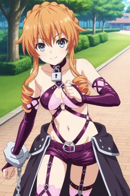 aakaguya, 파란 눈, 주황색 머리, 왕관 땋은 머리, 드릴 머리, kaguyaspirit, 자물쇠, 목걸이, 결박 복장, 보라색 장갑, 팔꿈치 장갑, 단일 손아귀, 배꼽, 허리 망토, 보라색 반바지, 짧은 반바지, 기스스트랩, 보라색 허벅지 부츠, 애니메이션 컬러링,
