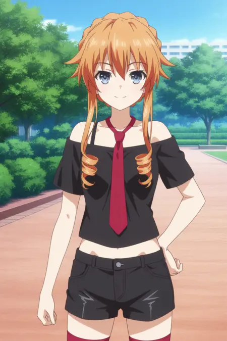 aakaguya, 파란 눈, 주황색 머리, 왕관 땋은 머리, 드릴 머리, kaguyac1, 빨간 티셔츠, 체인 프린트, 회색 반바지, 애니메이션 컬러링,