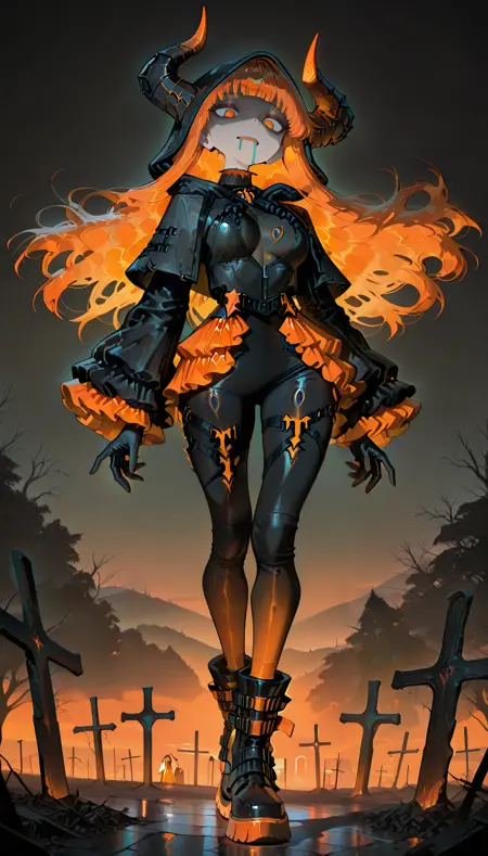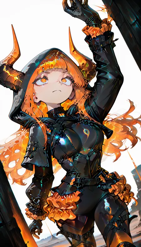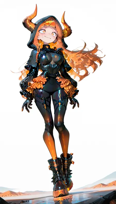 hood up,bodysuit, orange eyes,boots,bangs,orange frills on wrist,black gloves, covered breasts,