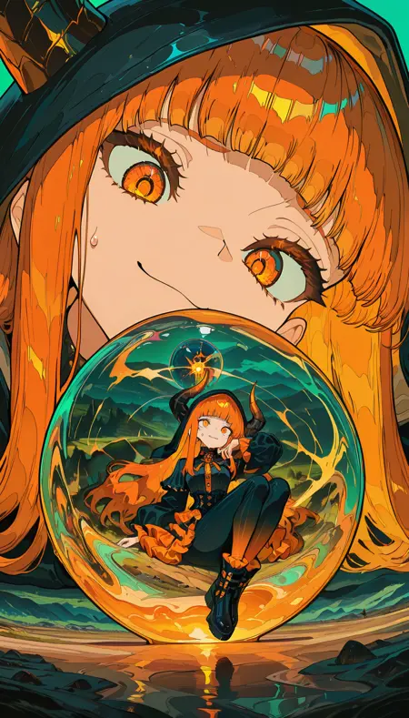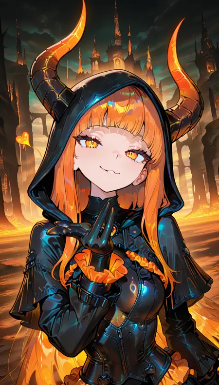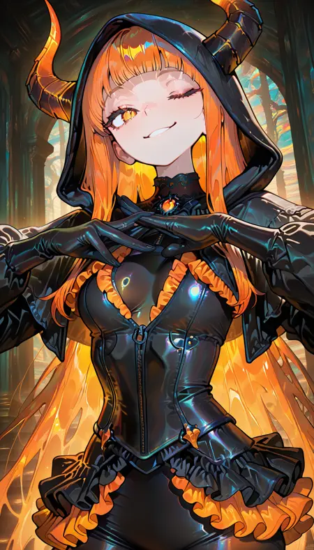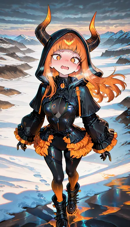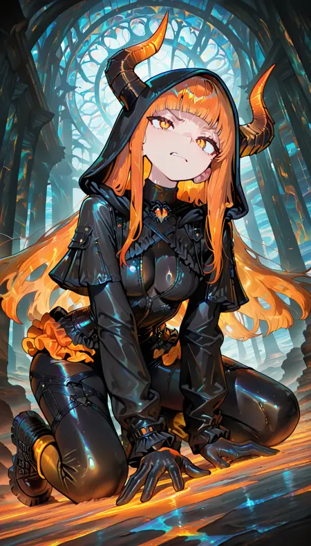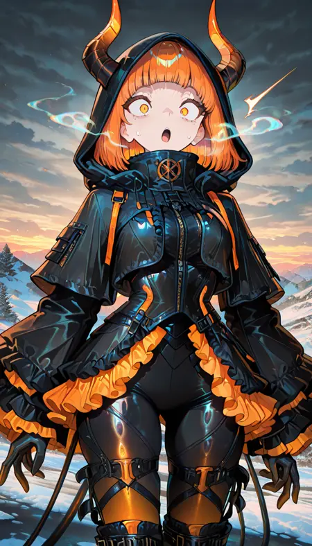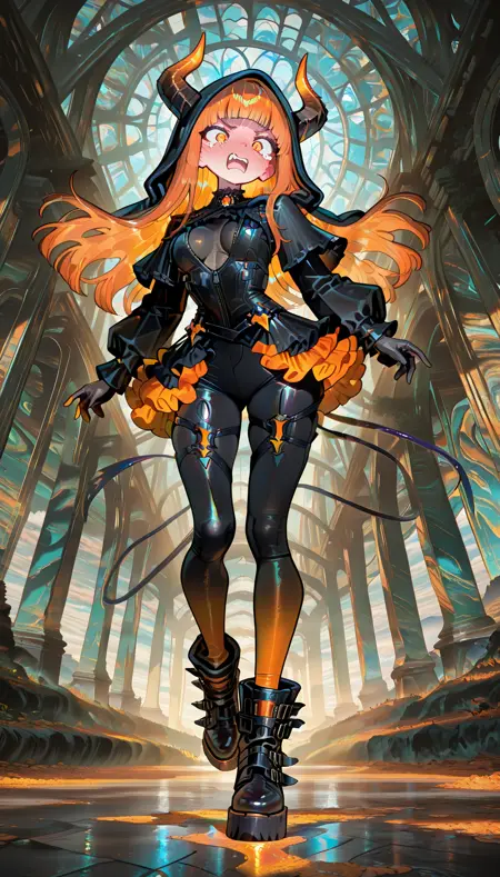 hood up,bodysuit, orange eyes,boots,bangs,orange frills on wrist,black gloves, covered breasts,