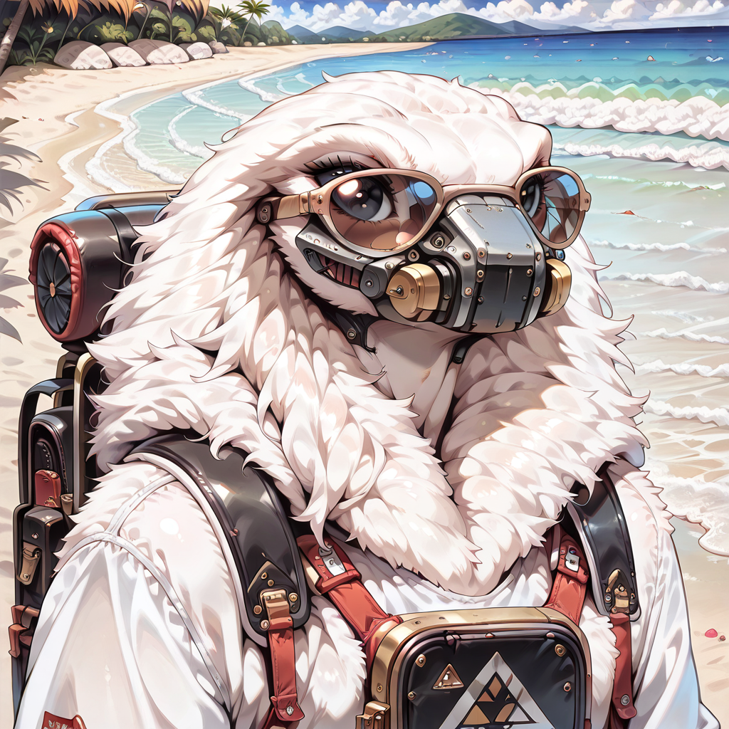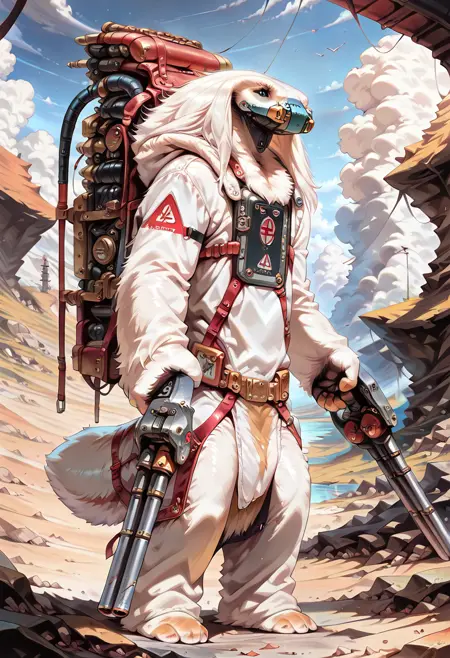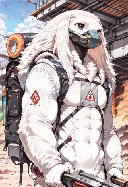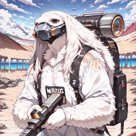 额外标签:外星人、科技背包、白色毛发、长发、面罩、毛茸茸的身体、黑眼睛