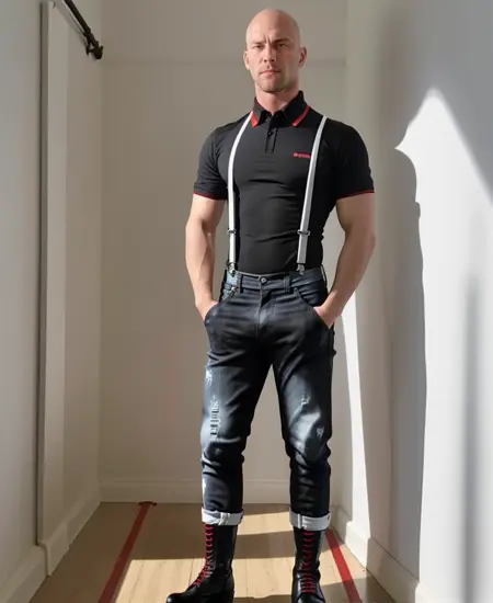 Trained on pictures of men wearing skinhead outfits: bleached jeans, boots, bomber jackets, and occasional rubber fetish gear. No neo-nazi bs in training images.
