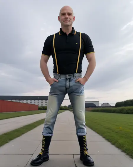 피부머리 복장을 입은 남성들의 사진으로 학습됨: 표백된 청바지, 부츠, 보머 자켓, 가끔 고무 페티시 장비. 학습 이미지에는 신나치주의 내용 없음.
