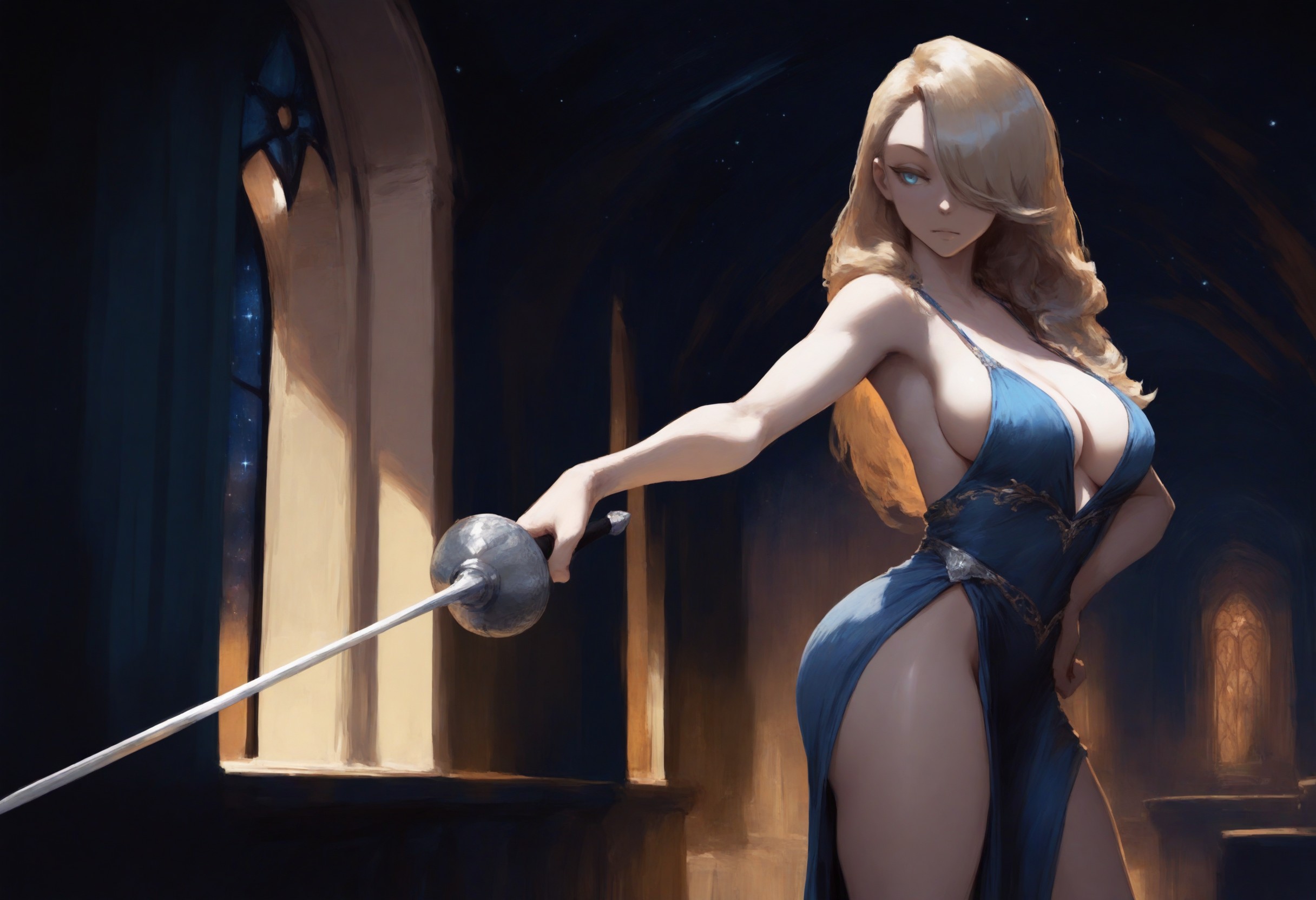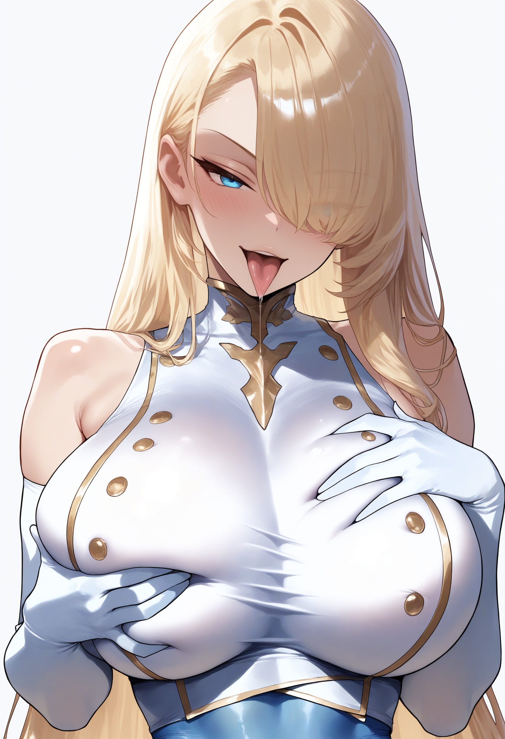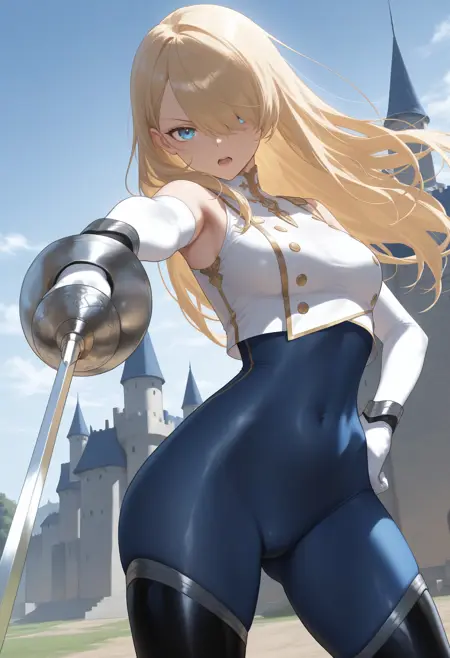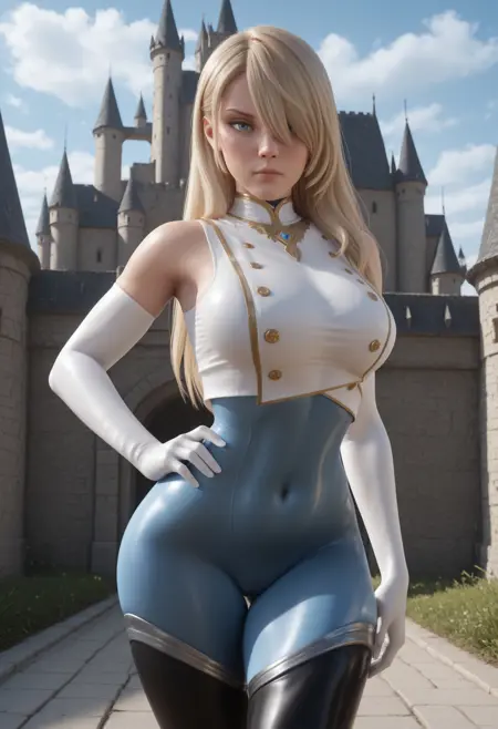 Trigger Words for Iron Monarch: blonde hair, long hair, hair over one eye, blue eyes, coat on shoulders, white coat, striped bow, cropped shirt, turtleneck shirt, white shirt, double-breasted shirt, gold button, gold trim, white gloves, elbow gloves, blue bodysuit, sleeveless bodysuit, skin tight, black thigh boots, high heels,