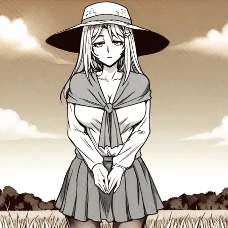 1. ((small yellow hair clip, sexy off-shoulder long-sleeves cream-colored blouse, light brown knotted shoulder shawl, obscene cleavage, huge cleavage, pleated red skirt, sexy brown pantyhose, )) sexy purple lace panties, red shoes, light brown floral-print knotted shoulder shawl,