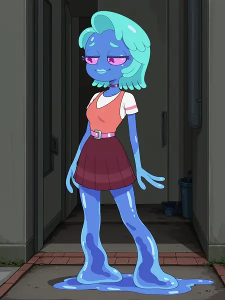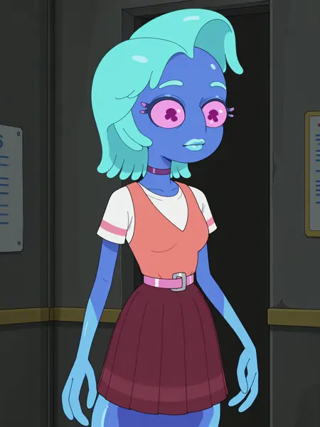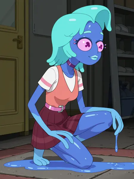 トリガー:s8mortygf、1girl、solo、monster girl、青い肌、ピンクの目、鼻なし、触手の髪、水色の髪、水色の唇、(脚なし:1.2)、指の数が少ない、紫の首輪、白いシャツ、短い袖、袖のピンクのストライプ、ベスト、ピンクのベルト、深紅のスカート、プリーツスカート、スライムの跡