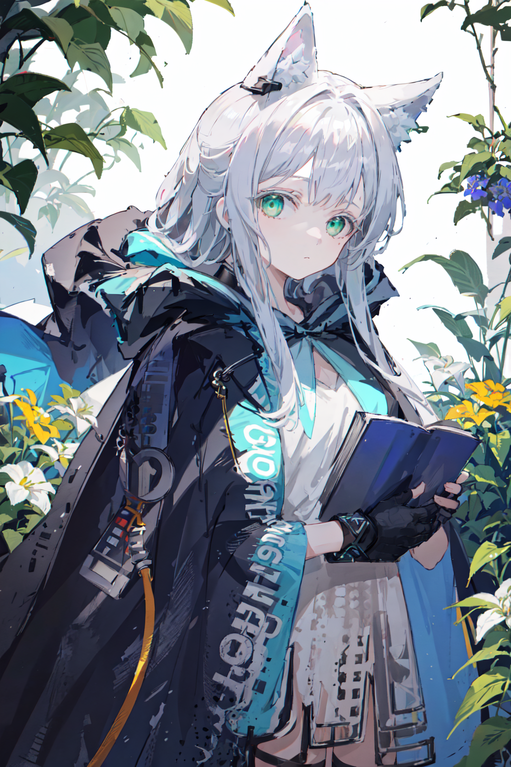 white eyelashes, 1girl, animal ears, green eyes, long hair, cat ears, grey hair, cat girl, cat tail, tail, animal ear fluff, bangs