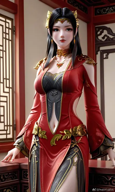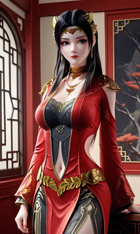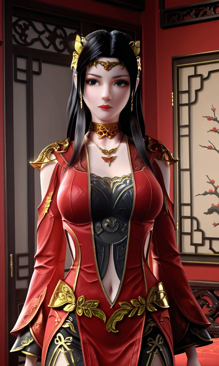 美杜莎,1个女孩,独奏,黑发,长发,黑眼睛,发饰,珠宝,连衣裙,红色连衣裙,项链,中式服装,肚脐,服装镂空,3D,写实,