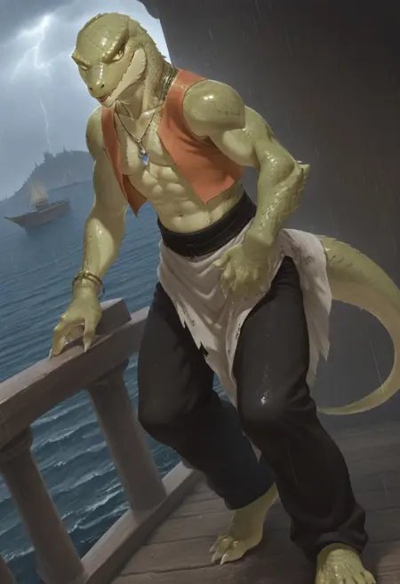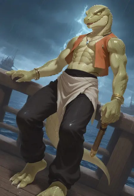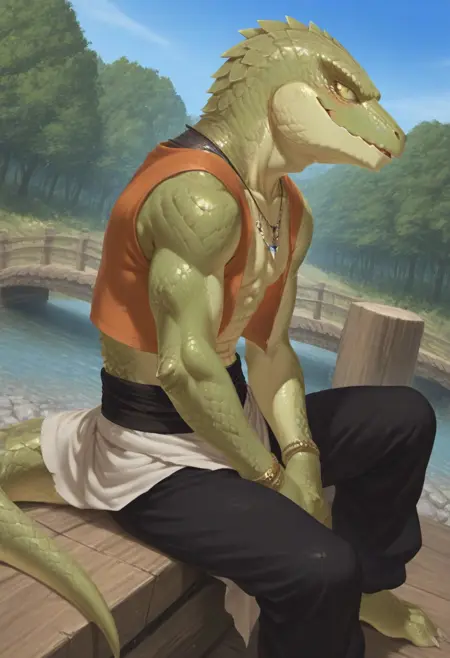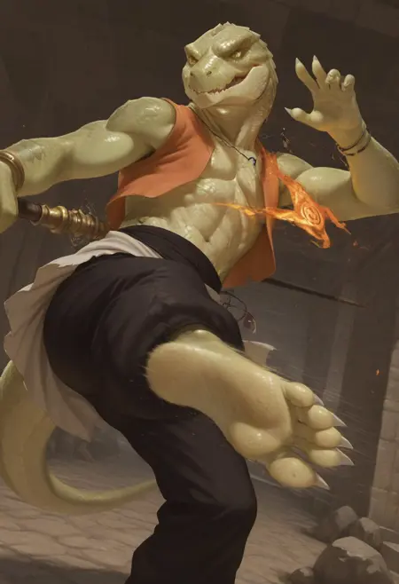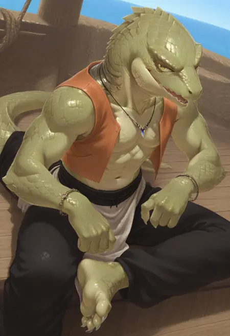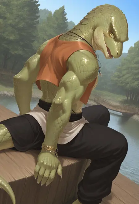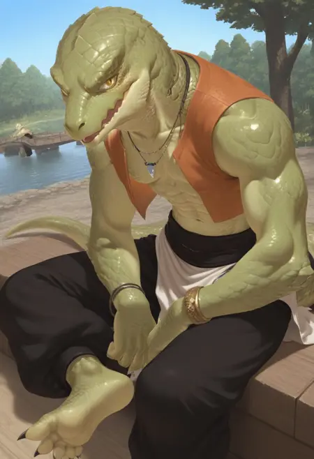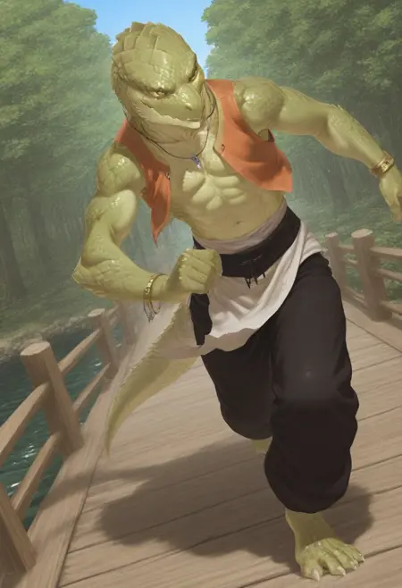 (skink face:1.7), (dragon face:1.2), cool, sharp face, (anime eyes:1.8), glances, narrow chin, (large scales hair:1.5), (combed-back scales hair:1.5), (bald:1.2), muscular, human body, human foots, (light green skin:2.5),