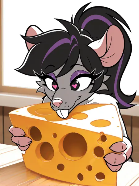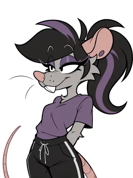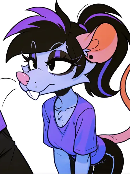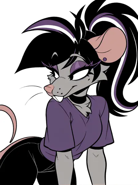 Triggers: anthro, female, rat, buckteeth, ponytail, grey body, black hair, purple highlights