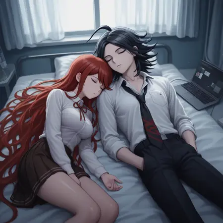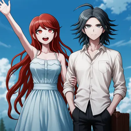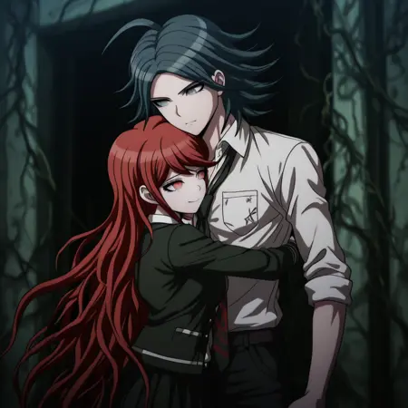 両者を一緒に:danganronpa/zero, danganronpa_(series), matsuda_yasuke, otonashi_ryouko, 1boy, 1girl, ahoge, black_hair, grey_eyes, long_hair, necktie, red_hair, school_uniform, very_long_hair, skirt, gray skirt