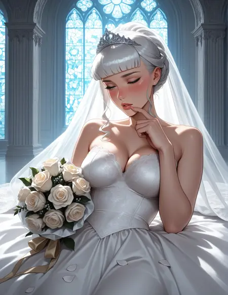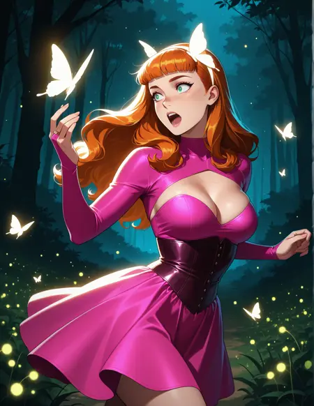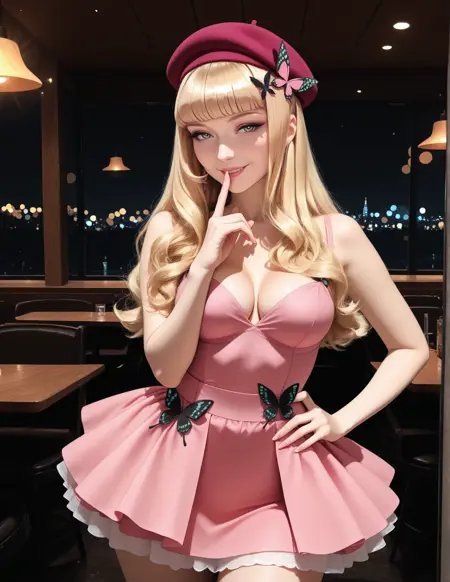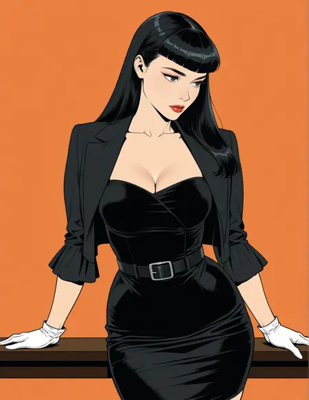 "blunt bangs"를 1950년대 베티 페이지 스타일의 핀업 전면 앞머리로 정의하려는 시도. 사진은 레이언스지만, 베티 페이지 데이터로 학습되지 않음.