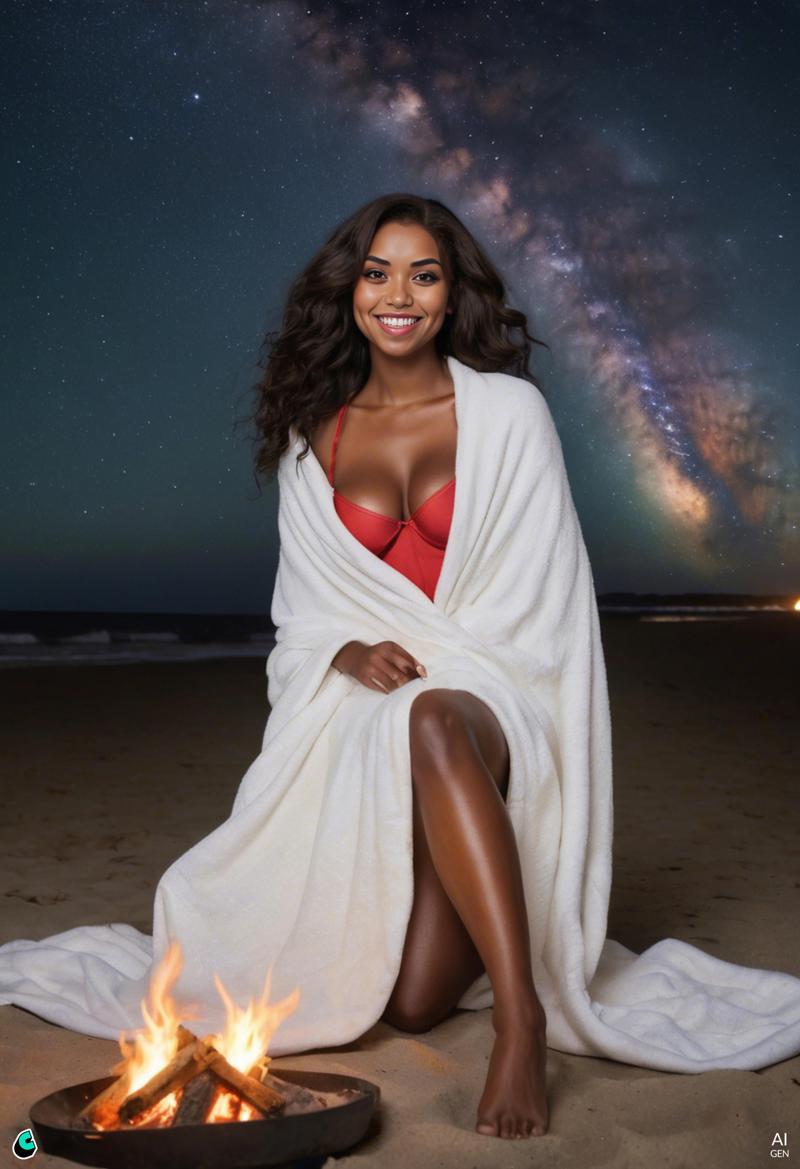 This is my second attempt to capture a particular face. AI Influencer Owa Knight is the subject. I made it on cantina with this prompt selfie on the beach, wrapped in a blanket, with the campfire and milky way behind me