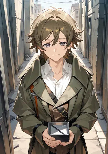oliver fog, brown eyes, brown hair, default, coat, multicolored_hair, top hat, umbrella,