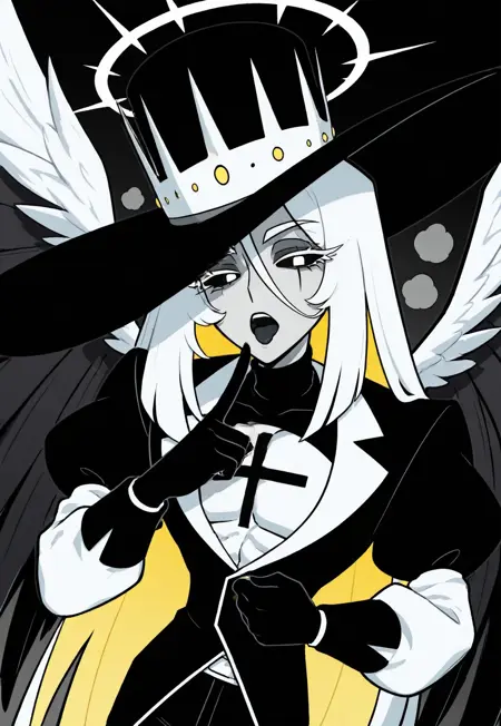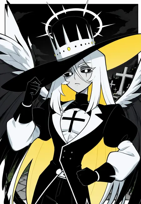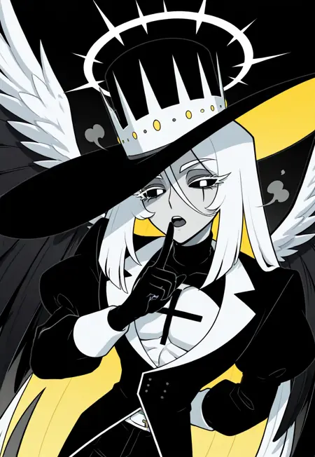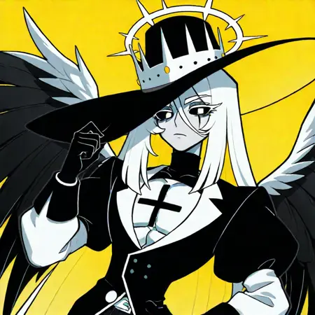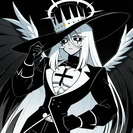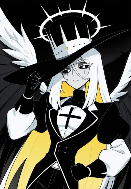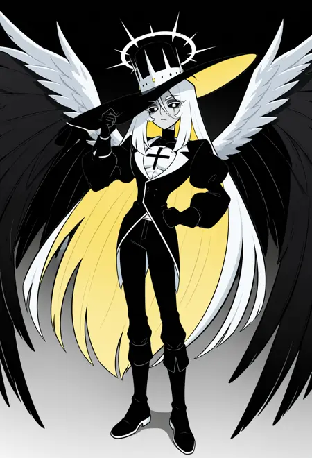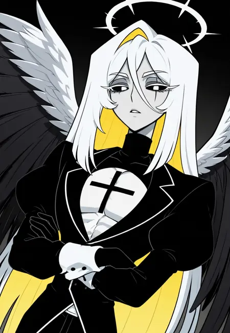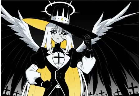 | 학습된 단어 | 1boy, long limps, mature, handsome, Nael, broad chest, cleavage white cross on chest, crusader white cross, covered chest, black chest, black sclera, colored sclera, white eyes, white eyelashes, lower eyelashes, very long eyelashes, white hair, hair between eyes, very long hair, scar on eye, white skin, colored skin, black hands, blonde inner hair, black straight hat, long hat, white crown around hat, (((black suit, black shirt)), turtleneck, ((black lapels)), colored inner hair, shinging halo, glowing halo, glowing eyes, black sleeves, puffy sleeves, white cuffs, long sleeves, black hands, white belt, black pants, tailcoat, yellow inner tailcoat, wings, archangel, black wings, giant wings, black boots, simple boots 복사됨! |