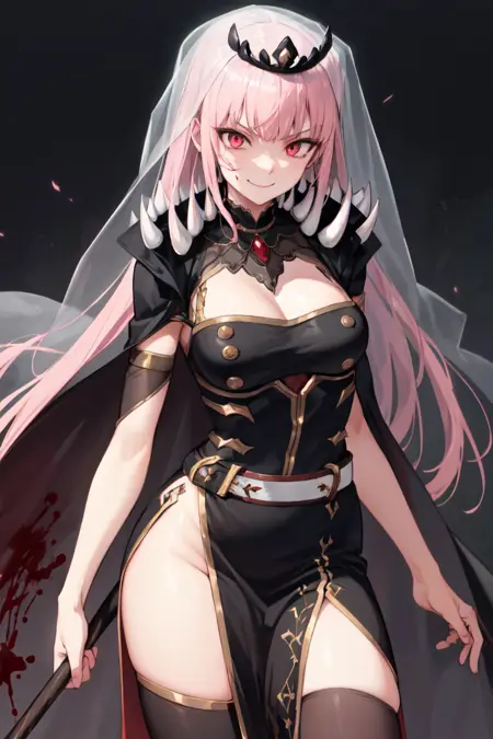 "MoriBase, long hair, veil, tiara, long black sleeveless dress, side slit, torn black cape, shoulder spikes, single black thighhigh, detached sleeves, see-through sleeve"