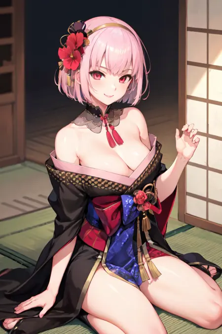 "MoriNewYears, short hair, detached collar, black kimono, bare shoulders, sash"