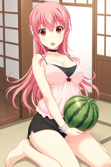 黑色项圈,休闲装,粉红色吊带背心,荷叶边连衣裙,无袖连衣裙,细吊带,黑色背心,露肩,锁骨,乳沟,胸脯开叉,红色蝴蝶结,胸部蝴蝶结,手镯,腹部,黑色短裤,超短裤,赤脚,凉鞋,白色鞋履,