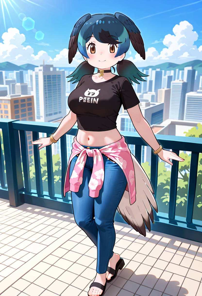 [외모] 여우비둘기 \(케모노 프렌즈\), 새 소녀, 새 꼬리, 꼬리, 새 날개, 머리 날개, 추가 귀, 다색 머리카락, 파란 머리카락, 검은 머리카락, 트윈테일, 낮은 트윈테일, 짧은 트윈테일, 측면 머리카락, 갈색 눈,