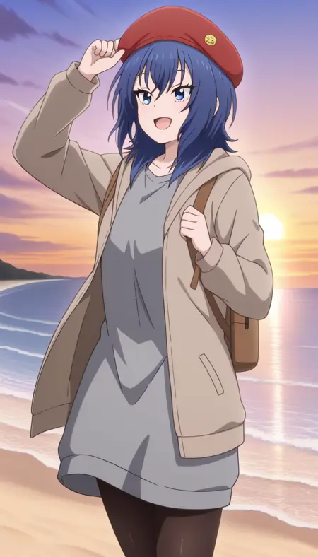 - Variant (Regular shirt): red beret, backpack, brown jacket, open jacket, white shirt, long skirt, blue skirt, pantyhose