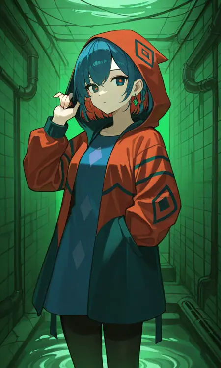 r1m n1ghtw1ng, short hair, earrings, side braid, red jacket, multicolored jacket, hooded jacket, long sleeves, hood down, blue dress, black pantyhose如需提升发丝精度,请添加