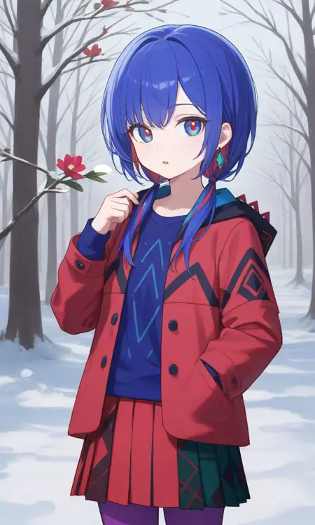 r1m n1ghtw1ng, short hair, earrings, side braid, red jacket, multicolored jacket, hooded jacket, long sleeves, hood down, blue dress, black pantyhose髪の再現性を高めたい場合は、