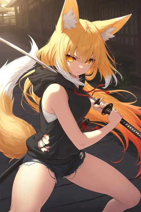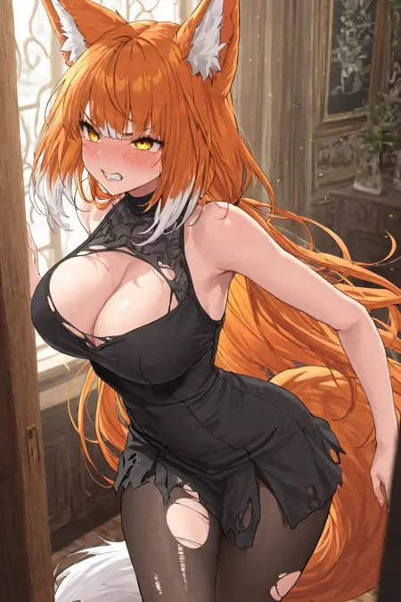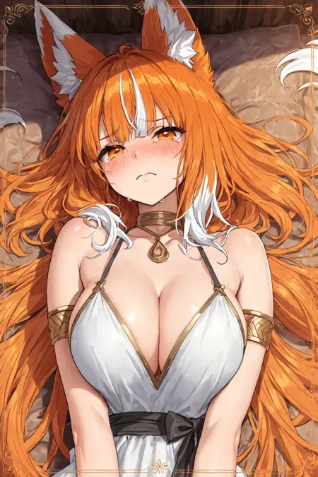 Orreti, orange hair, long hair, bangs, fox ears, fox tail, white hair tips, orange eyes