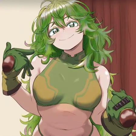 | 학습된 단어 | Base: Toru, green hair, blonde hair, multicolored hair, long hair, messy hair, green eyes, pale skin, slim body, larges breasts,복사됨! Outfit: crop top, sleeveless top, green outfit, high collar, gloves, golden gloves, green thong, brown boots,복사됨! |
