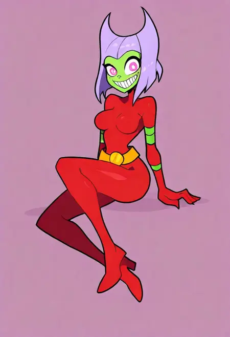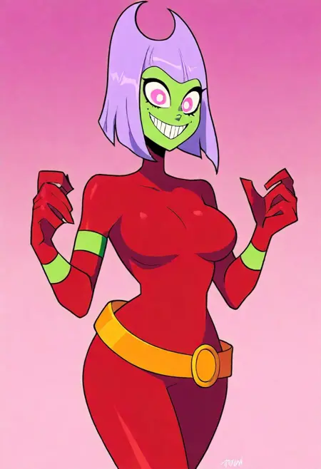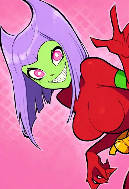 | トレーニングワード | buttwitch01, 1girl, solo, red body, green face, purple hair, large toothy smile, sharp white teeth, glowing pink eyes, tight red catsuit, wide yellow belt, lime green armbands, shoulder-length purple hair, center hair part, crescent-shaped bangs, long red arms, long red fingers, five-fingered handsコピーしました! |