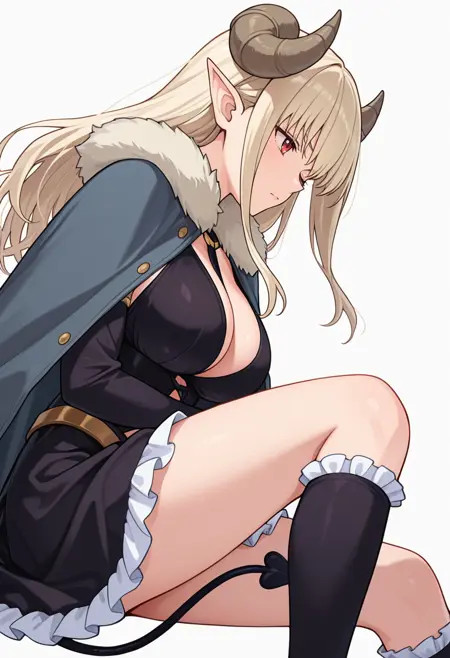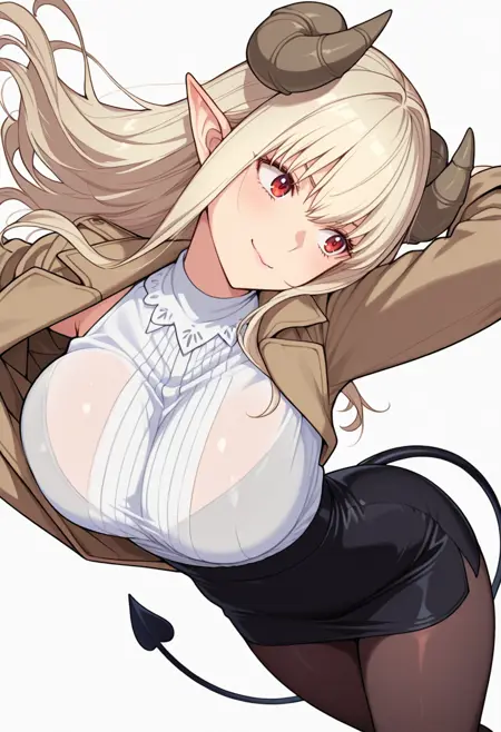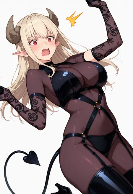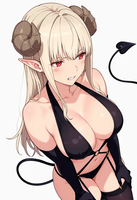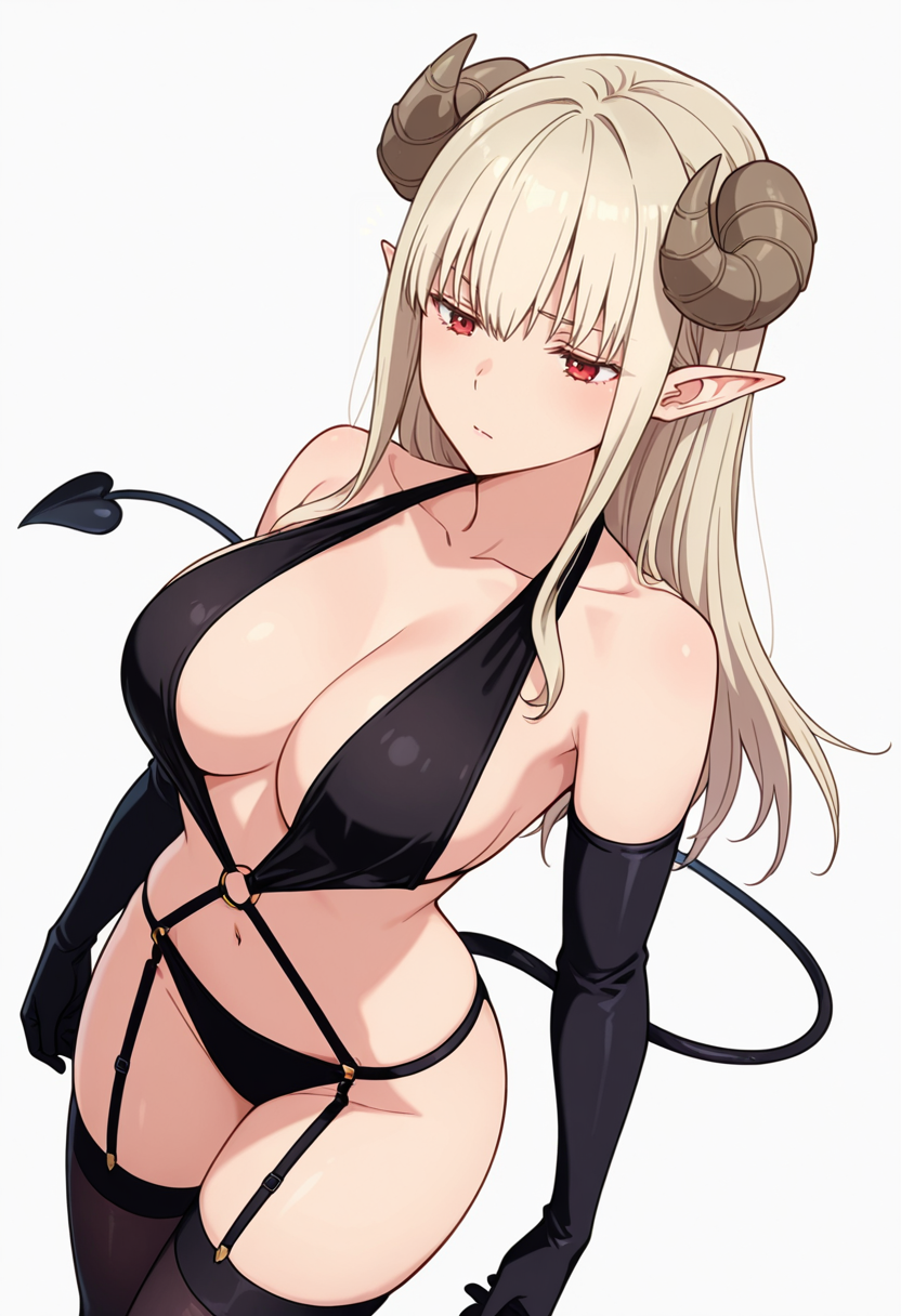 lustalotte_cnr,恶魔女孩, 1girl, 金发, 长发, 红眼, 齐刘海, 尖耳, 恶魔角, 恶魔尾巴, 大胸,