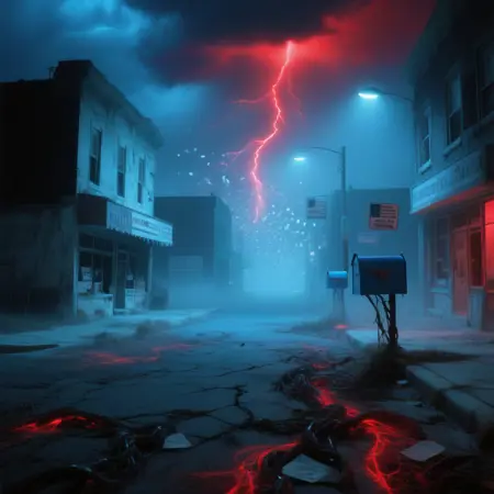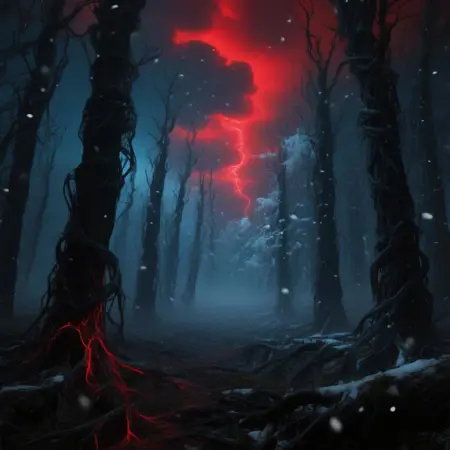 暗黑超现实景观、恐怖环境、异界维度、冷蓝调环境光、猩红发光云层、氛围雾气、发光白色尘埃、漂浮灰烬粒子、低饱和色彩、诡异静谧、被污染的自然、黑色触须、发光红血管、电影级恐怖光影、腐朽建筑、非自然的静止、幽灵氛围、柔和雾层叠加、死寂氛围、苍白蓝调、超现实世界设计、脉动有机纹理、梦幻恐怖、冻结的现实、废弃结构、腐烂表面、高对比光影、恐怖风格腐化、压迫性环境、慢动作氛围