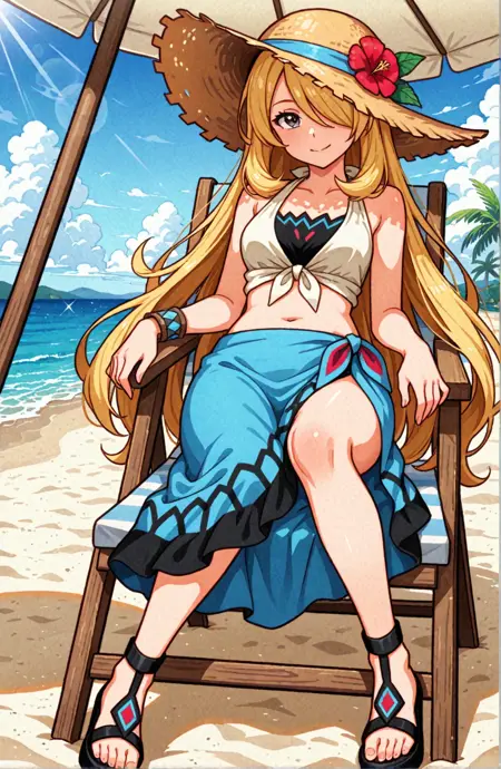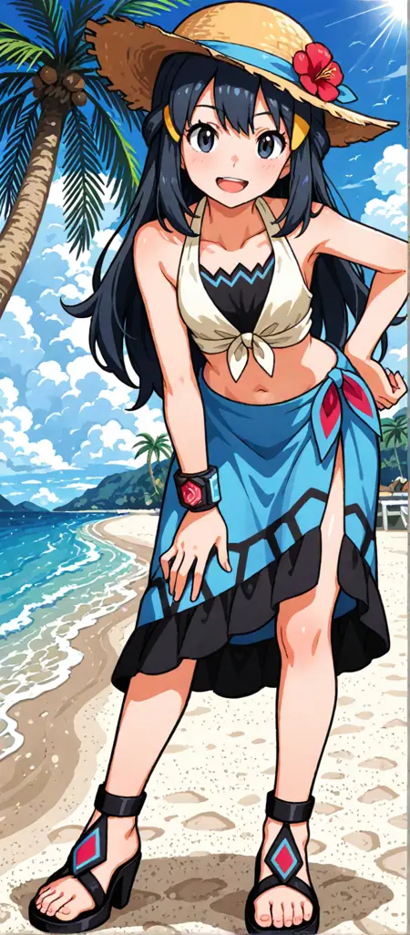 모자, 햇빛용 모자, 짚 모자, 모자 꽃, 히비스크스, 민소매 셔츠, 흰색 셔츠, 검은색 셔츠, 앞쪽 매듭 상의, 허리 부분, 한쪽 손목 팔찌, 파란색 사롱, 검은색 사롱, 하이힐 샌들, 검은 신발