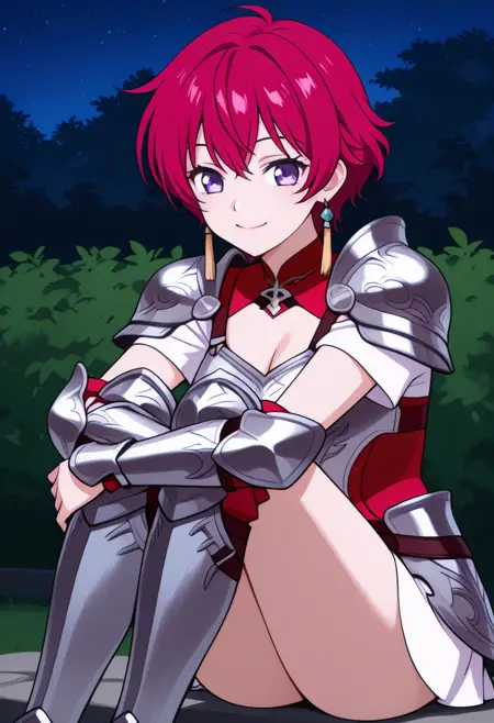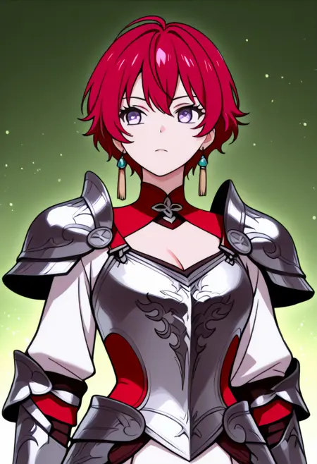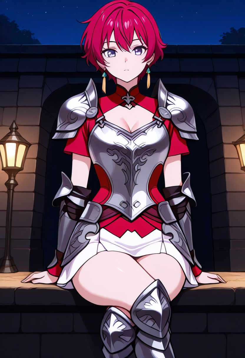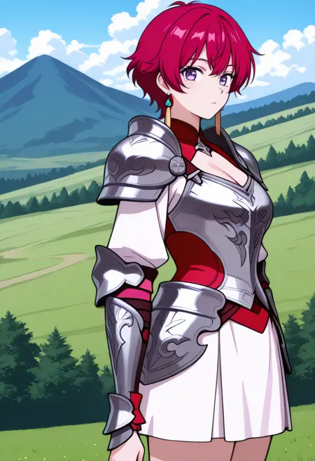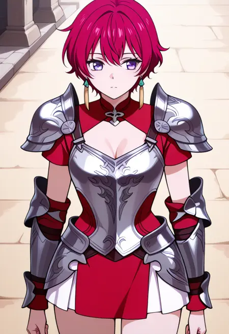 1girl, fantasy, silver armor, white skirt, red accents, breastplate, pauldrons, gauntlets, armored boots, short skirt, deep cleavage, corset, high collar, short sleeves, exposed midriff, armored thighs, anime screencap