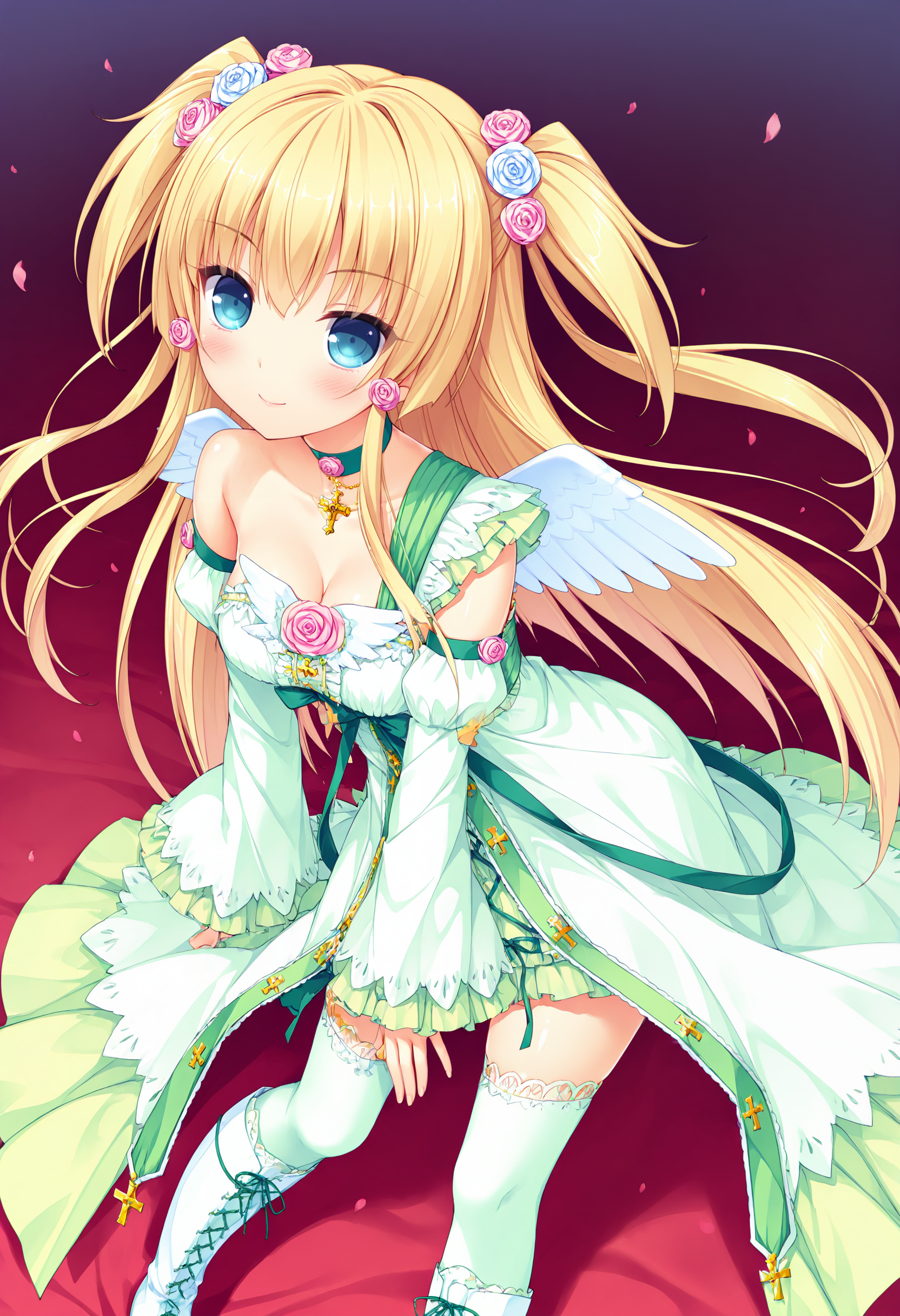 TIANSHI,green dress,wings,hair flower,rose,white thighhighs,gold jewelry,flower choker,detached sleeves,gold cross,gold jewelry,green ribbon,