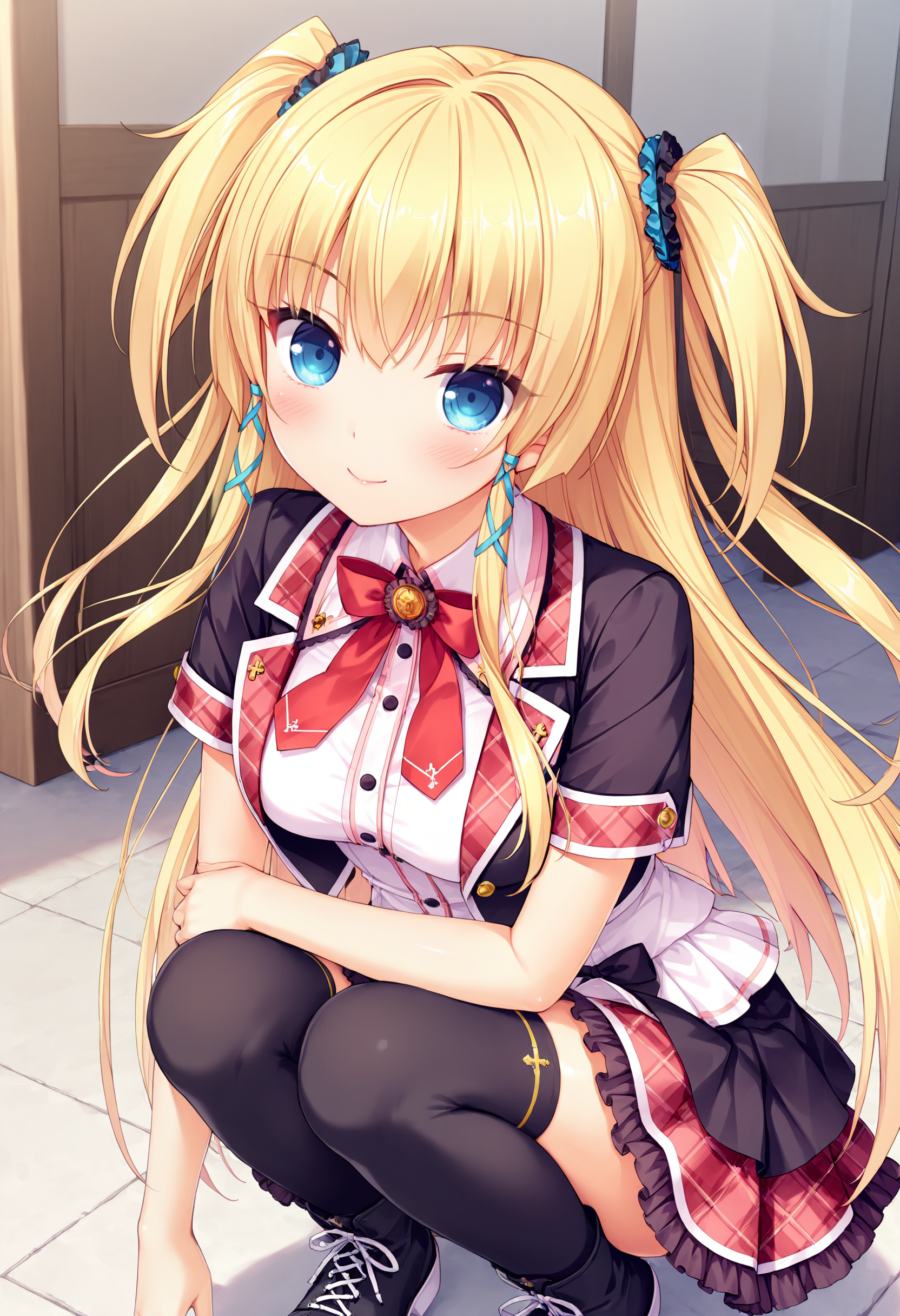 XIAOFU,hair ribbon,black skirt,black thighhighs,plaid,purple frills,black buttons,white shirt,black cropped jacket,open jacket,red bowtie,bow,ribbon,