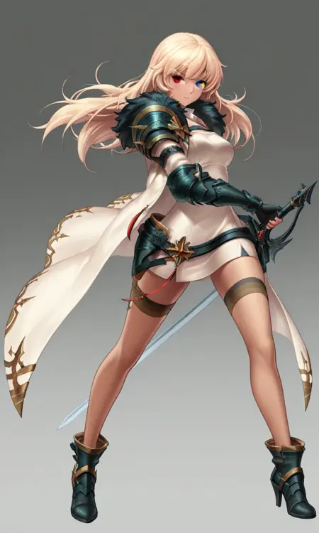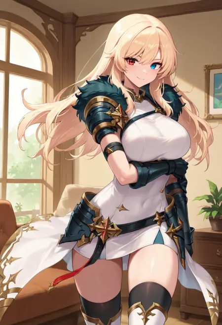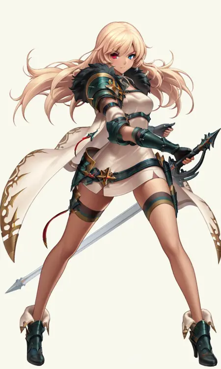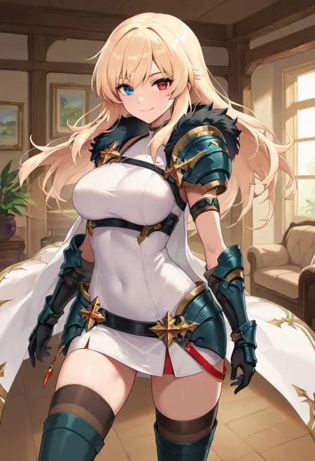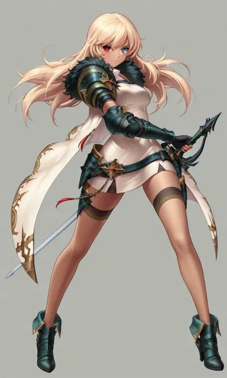shane,1girl,solo,blond hair, long hair, heterochromia,red eyes,blue eyes, short dress, single shoulder pad, fur trim, armor, arm bands,thigh highs, heels,