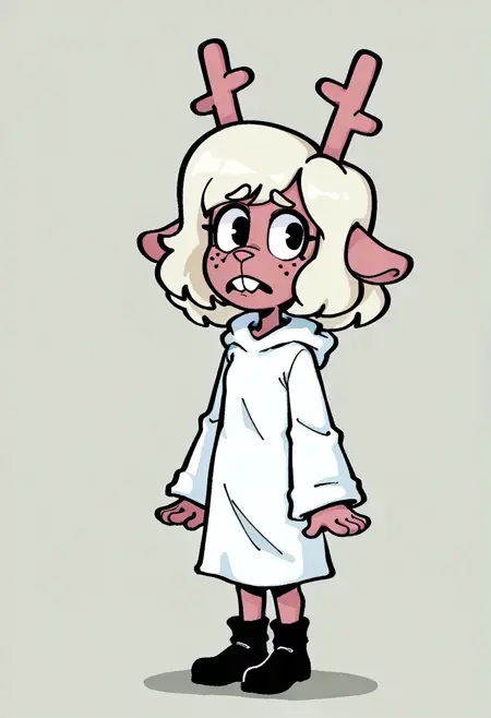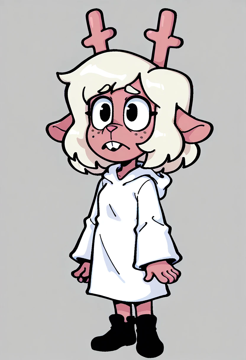 NoelleHolidayB3, 1girl, pale blonde hair, pinkish brown fur, long white dress-robe with a hood, ample sleeves, black shoes, black eyes, freckles, buck teeth, light pink nose, antlers, short, chibi